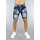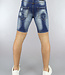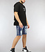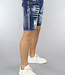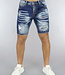 Deze korte broek is gemaakt van een acid washed jeans stof en hij heeft door alle details een damaged look. De benen hebben een wassing, krassen, scheuren en kleine verfspatten. De broek valt tot net boven de knie en bevat weinig tot géén rek. Zowel aan de voor- als aan de achterkant zitten twee steekzakken. De tailleband heeft rondom zes lusjes waar eventueel een riem doorheen gehaald kan worden. De sluiting bestaat uit vier knopen.