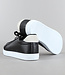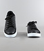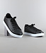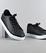 Deze sneakers zijn gemaakt van een stevig materiaal en hebben een dunne zool. De schoenen hebben zwarte veters en een wit hielstuk.