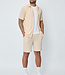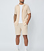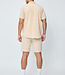 Deze beige heren set bestaat uit een open overhemd met korte mouwen en een korte broek in dezelfde kleur en stof. Het overhemd heeft een relaxte pasvorm, open kraag en sluit met knopen aan de voorkant. De short is voorzien van een elastische tailleband en twee steekzakken. Beide stukken zijn gemaakt van een lichte structuurstof die zacht aanvoelt en goed ademt. Ideaal voor warme dagen waarop comfort en stijl samenkomen. Door de effen kleur is de set makkelijk te combineren met een basic T-shirt of sneakers.