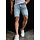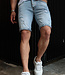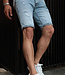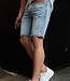 Deze lichtblauwe jeansshort voor heren is vervaardigd uit denim en heeft een opvallend gewassen uitstraling. De short is voorzien van meerdere versleten details en slijtplekken op het voorpand, wat zorgt voor een 'destroyed' effect. De broekspijpen zijn aan de onderkant opgerold en de zomen hebben een lichte contrasterende binnenzijde. De short heeft een klassieke 5-pocket stijl en een 4-knoopsluiting. Dankzij het lichte denim en de ruwe afwerking is deze short ideaal voor zomerse, casual outfits met een stoer randje.