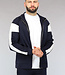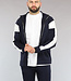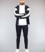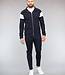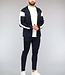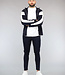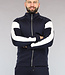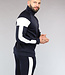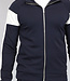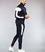 Dit zwarte trainingspak is gemaakt van een glimmende stretch stof en bestaat uit een broek en een vest. Het vest heeft een hoge kraag. Aan de voorkant zit een ritssluiting met twee steekzakken. De broek heeft een elastische tailleband met vetersluiting. Hij heeft twee steekzakken en de pijpen hebben aan de onderkant een elastisch boord. Kan casual gedragen worden, of als sportpak!