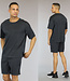 Deze mannen set bestaat uit een short en een shirt. De korte broek heeft een elastische tailleband met vetersluiting en twee steekzakken aan de voorzijde. Aan de achterkant zit nog een kleine steekzak. Het shirt is oversized en voorzien van korte mouwen en een ronde halslijn. Beide items zijn gemaakt van een ribbelpatroon en bevat veel stretch.