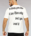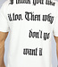 Dit T-shirt is gemaakt van een fijne katoenen stof. Het shirt heeft korte mouwen en een ronde hals. Het T-shirt is ecru van kleur en daarom een goede basic. De voorkant van het shirt heeft de tekst "I think you like it too. Then why don't you want it." en de achterkant heeft een grote print met dezelfde tekst.