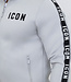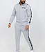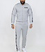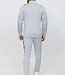Dit tweedelige pak is gemaakt van een polyester stretchstof en bestaat uit een broek en een vest. Het vest heeft een opstaande kraag. Aan de voorkant zit een grijze ritssluiting en hij heeft twee zakken welke ook een grijze ritssluiting bevatten. Het trainingspak heeft over de schouder doorlopend naar de boorden een tape detail met tekst. Hij heeft lange mouwen met aan het uiteinde een elastisch aansluitende boord. De broek heeft een elastische tailleband welke ook voorzien is van een aantrekkoord. Over de zijkanten van de broek is hij voorzien van hetzelfde tape detail als op het vest. Hij is aan de voorkant voorzien van twee steekzakken.