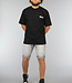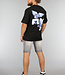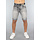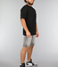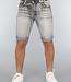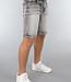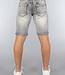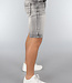 Deze korte broek is gemaakt van een grijze stretch jeans stof en hij is voorzien van een lichte wassing. De broek valt tot net boven de knie. Zowel aan de voor- als aan de achterkant zitten twee steekzakken. De tailleband heeft rondom zes lusjes waar eventueel een riem doorheen gehaald kan worden. De sluiting bestaat uit een rits en een knoop. Tevens wordt de short ook geleverd inclusief riem.