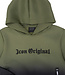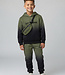 Dit trainingspak voor kinderen bestaat uit een hoodie, een bijpassende broek en een tasje . Het pak is uitgevoerd in groen met een zwarte kleurverloop aan de onderzijde. De hoodie heeft een vaste capuchon, lange mouwen en ribboorden aan de mouwen en zoom. Aan de voorzijde bevinden zich afsluitbare zakken met rits. De broek heeft een elastische tailleband met aantrekkoord, een taps toelopende pasvorm en elastische boorden aan de onderzijde. Zowel de hoodie als de broek zijn voorzien van een bedrukt tekstdetail. Het materiaal is glad en licht elastisch. Het bijpassende tasje is uitgevoerd in dezelfde kleuren en wordt meegeleverd als onderdeel van de set.
