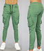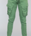 Deze toffe cargo broek is groen en heeft een aansluitend model met rek waardoor hij comfortabel draagt. Aan de voorkant zitten twee steekzakken en aan de zijkant zitten ook twee zakken met klep- en druksluiting. De tailleband is elastisch en voorzien van een zwarte vetersluiting. Op de billen zitten ook nog twee steekzakken.