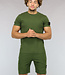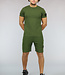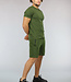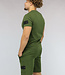 Deze mannen set bestaat uit een short en een shirt. De korte broek heeft een elastische tailleband met vetersluiting en twee steekzakken aan de voorzijde. Het shirt is aansluitend en voorzien van korte mouwen en een ronde halslijn. Beide items bevatten bevat veel stretch. Zowel de broek als het T-shirt zijn voorzien van tags.