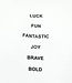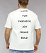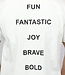 Dit T-shirt is gemaakt van een fijne katoenen stof. Het shirt heeft korte mouwen en een ronde hals. Het T-shirt is ecru van kleur en daarom een goede basic. De voorkant van het shirt heeft de tekst "Luck, Fun, Fantastic, Joy, Brave, Bold." en de achterkant heeft een grote print met dezelfde tekst.