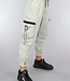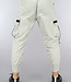 Deze toffe cargo broek is lichtgrijs van kleur en heeft een los model met weinig rek. Aan de voorkant zitten twee steekzakken en aan de zijkant zitten ook twee zakken met klepsluiting. Tevens beschikt de broek ook over twee kontzakken. De tailleband is elastisch en voorzien van een vetersluiting.