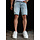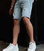 Deze heren jeansshort in een opvallende lichtblauwe kleur heeft meerdere gescheurde en versleten details op het voorpand. De denim heeft een stonewashed effect en is afgewerkt met rode stiksels aan de omgeslagen pijpen. De short heeft een 5-pocket model, een normale taille en een 4-knoopsluiting. De zoom is licht gerafeld en dubbel omgeslagen voor een extra casual look. Het materiaal is soepel en bevat stretch en is geschikt voor zomerse, stoere combinaties.