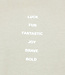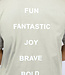 Dit T-shirt is gemaakt van een fijne katoenen stof. Het shirt heeft korte mouwen en een ronde hals. Het T-shirt is taupe van kleur en daarom een goede basic. De voorkant van het shirt heeft de tekst "Luck, Fun, Fantastic, Joy, Brave, Bold." en de achterkant heeft een grote print met dezelfde tekst.