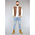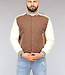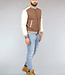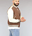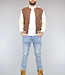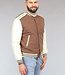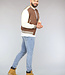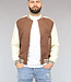 Dit bomberjack is gemaakt van een bruine, dikke stof en voorzien van crème lederlook mouwen. Hij heeft een ronde halslijn en lange mouwen. Aan de voorkant zit een knoopsluiting bestaande uit zes drukknopen. Tevens beschikt hij over twee steekzakken en rondom de onderzijde zit een elastisch boord waardoor je een bomber effect krijgt.