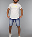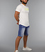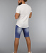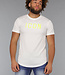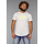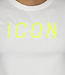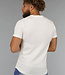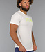 Dit T-shirt is gemaakt van een stof met structuur. Het shirt heeft korte omgeslagen mouwen en een ronde hals. Het T-shirt is wit van kleur met een felle neon opdruk. De onderkant van het T-shirt loopt rond af.