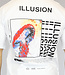 Dit katoenen shirt heeft korte mouwen en een ronde halslijn. Je kan eventueel de mouwtjes oprollen om hem net wat stoerder te maken! Hij valt oversized. Aan de voorkant staat een afbeelding op de borst en op de rug de tekst: 'Illusion' met daaronder dezelfde afbeelding.