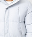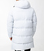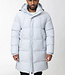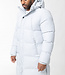 Deze witte pufferjas is een lange, volledig gewatteerde winterjas met een uniforme matte buitenlaag en brede horizontale quiltbanen. De jas heeft een ruime capuchon met verstelkoorden, een doorlopende ritssluiting met drukknopensluiting en twee verticale ritszakken aan de voorkant. De mouwen zijn dik gewatteerd en afgewerkt met zachte ribgebreide manchetten die zorgen voor extra warmte-isolatie. De jas valt ruim over de knie en biedt maximale bescherming tegen koude weersomstandigheden.