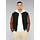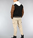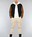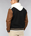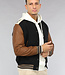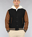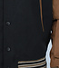 Dit bomberjack is gemaakt van een zwarte, dikke stof en voorzien van bruine lederlook mouwen. Hij heeft een ronde halslijn en lange mouwen. Aan de voorkant zit een knoopsluiting bestaande uit zes drukknopen. Tevens beschikt hij over twee steekzakken en rondom de onderzijde zit een elastisch boord waardoor je een bomber effect krijgt.