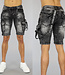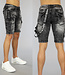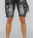 Trefwoorden: zwarte heren korte broek, denim short met krassen, stretch jeans short, spijkerstof, korte jeans, steekzakken, ritssluiting, knoopsluiting, damaged, old look, wassing, light washed, bretel