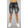 Deze korte broek is gemaakt van een stretch jeans stof en hij heeft een old look. De broek valt tot net boven de knie en is voorzien van diverse krassen en een lichte wassing. Zowel aan de voor- als aan de achterkant zitten twee steekzakken. Tevens zit er op beide benen een zak met klepsluiting. De tailleband heeft rondom zes lusjes waar eventueel een riem doorheen gehaald kan worden. De sluiting bestaat uit een rits met daarboven een enkele knoopsluiting. Aan de zijkant hangt een vaste bretel met opdruk en kunststof details.