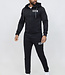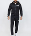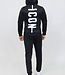 Dit tweedelige pak is gemaakt van een polyester stretchstof en bestaat uit een broek en een vest. Het vest heeft een capuchon met aantrekkoord. Aan de voorkant zit een zwarte ritssluiting en hij heeft twee zakken welke ook een zwarte ritssluiting bevatten. Het trainingspak heeft een opdruk op de borst en een grote opdruk op de rug. Hij heeft lange mouwen met aan het uiteinde een elastisch aansluitende boord. De broek heeft een elastische tailleband welke ook voorzien is van een aantrekkoord. Hij is aan de voorkant voorzien van twee steekzakken met rits. De pijpen van de broek zijn ook voorzien van elastische boorden.