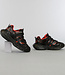 Trefwoorden: zwarte grove heren sneakers, sneakers met dubbele veter, zwarte zool met detail, sportschoenen, grove zool, gaatjes, rode details