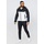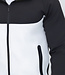 Dit tweedelige pak is gemaakt van een polyester stretchstof en bestaat uit een broek en een vest. Het vest heeft een capuchon met een trekkoord. Aan de voorkant zit een zwarte ritssluiting en hij heeft twee zakken welke ook een zwarte ritssluiting bevatten. Het vest heeft een colorblock en is aan de bovenkant zwart en het onderste gedeelte is wit. Op de rug is hij aan de bovenkant wit en is de onderkant zwart. Hij heeft lange mouwen met aan het uiteinde een elastisch aansluitende boord. De broek heeft een elastische tailleband welke ook voorzien is van een aantrekkoord. Hij is aan de voorkant voorzien van twee steekzakken.