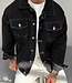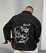 Deze zwarte denim jas voor heren combineert een stoer design met opvallende details. De jas heeft contrasterende witte stiksels en is voorzien van metalen knopen aan de voorkant en op de borstzakken. Op de rug staat een grote abstracte witte print met artistieke uitstraling, wat het item een eigentijdse streetstyle vibe geeft. De stevige denimstof zorgt voor een robuuste look en comfortabel draagcomfort. Perfect te dragen over een wit T-shirt of hoodie voor een modieuze casual outfit.
