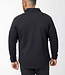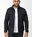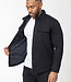 Deze zwarte shacket combineert het uiterlijk van een overshirt met het comfort van een lichtgewicht, gewatteerde jas. De buitenkant is uitgevoerd in een stevige, fijn geweven stof met een matte structuur. Aan de binnenzijde bevindt zich een doorgestikte voering in ruitpatroon die zorgt voor extra warmte. De voorkant sluit met stevige drukknoopjes en heeft een nette, klassieke kraag. Op de borst zit een grote klepzak met strakke, rechte naden. De mouwen zijn recht gesneden en afgewerkt met eenvoudige manchetten.