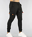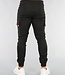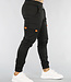 Deze stoere cargo broek is een echte musthave! Dit item is zwart en heeft een beetje een baggy model. Aan de voorkant zitten twee steekzakken en aan de zijkant ook twee zakken met klepsluiting. De zakken op de zijkant hebben een oranje detail. De tailleband is elastisch en voorzien van een vetersluiting. De onderkant van de pijpen hebben een elastiek waardoor je een pof effect krijgt.