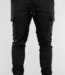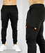 Trefwoorden: zwarte heren cargo broek, mannen pofbroek met zakken, baggy, broek met zakken, elastische tailleband, oranje detail