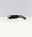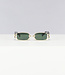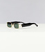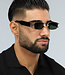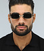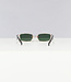 Deze zwarte zonnebril is perfect voor een festival! De zonnebril is voorzien van groene glazen en een goud breed montuur met open zijkanten en zwarte pootjes. Verder heeft de bril nog twee neuskussentjes.