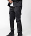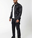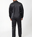 Deze zwarte two piece set bestaat uit een utility jacket en een cargo broek, beide uitgevoerd in een gladde, licht glanzende satijn stof met een stevige structuur. Het jack heeft een klassieke kraag, een volledig metalen ritssluiting en twee grote borstzakken met klep. De cargo broek heeft een aansluitende tailleband met riemlussen, een gulp met knoopsluiting en meerdere gestikte cargozakken langs de benen. De pijpen zijn recht en licht taps toelopend, met een soepele maar stevige valling.